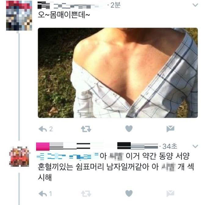 트위터에서 어떤 남성의 상반신 사진이 올라오는데, 그걸 보고 '약간 동양 서양 혼혈끼있는 쉼표머리 남자일 것 같다'면서 섹시하다고 합니다.