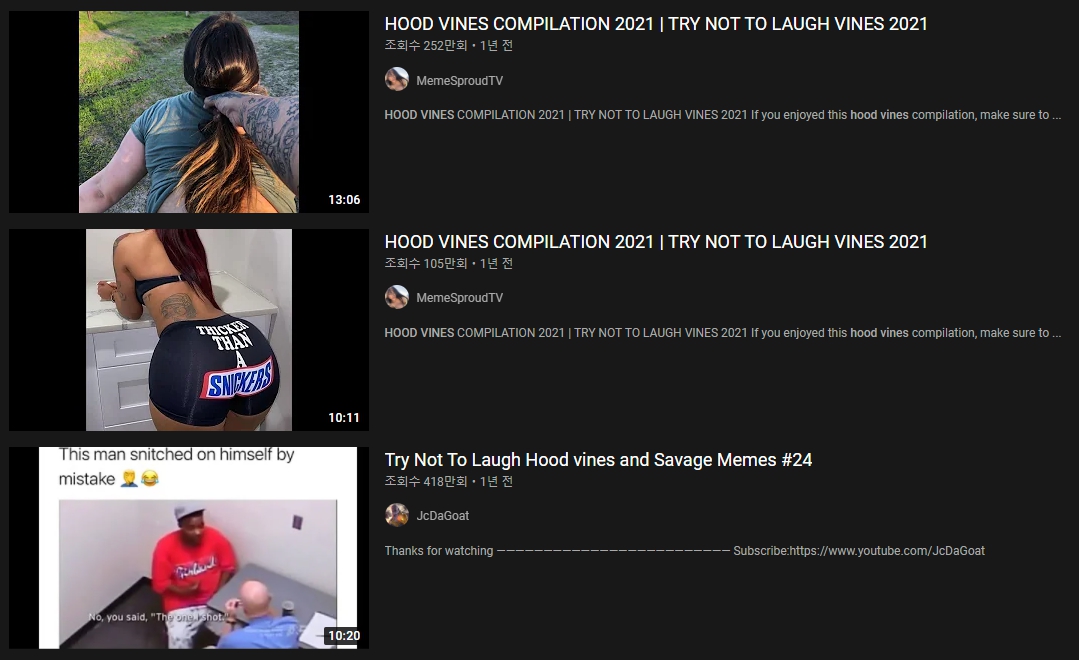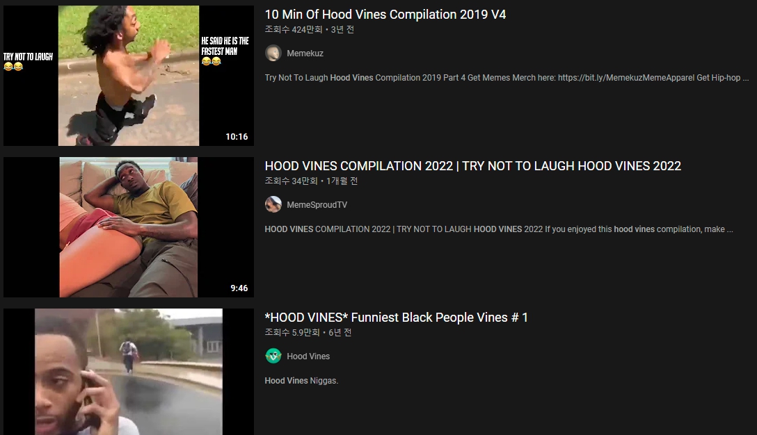 후드는 후들럼(hoodlum)의 축약어로 슬럼(slum)이라는 뜻과 같습니다. 굉장히 낙후되고 경제적으로 풍족하지 않고 치안이 좋지 않은 곳을 말합니다. 총기나 마약 등 범죄가 난무하는 지역이라 실제 미국에서 '후드에서 살아남기', '슬럼에서 살아남기' 등 검색어가 많았습니다. 여기에서 실제 후드에서 벌어지는 흑인들의 유쾌한 일상 영상들을 후드 바인즈(hood vines)라고 부르게 됩니다.