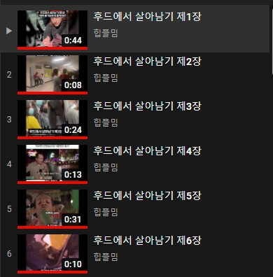 가운데 재생 버튼을 누르면 힙플밈의 후드밈, 후드에서 살아남기 시리즈를 감상할 수 있습니다.