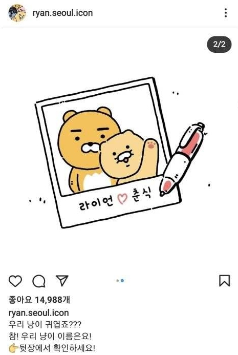 라이언 인스타그램 담당자가 과연 이러한 드립을 알았었는지, 몰랐었는지는 모르지만 여하튼 이 드립을 알고 있던 사람들이 열렬하게 춘식이란 이름에 반응을 한 거고 그 결과 라이언의 반려묘의 이름이 춘식이로 결정된 것이라고 할 수 있습니다.