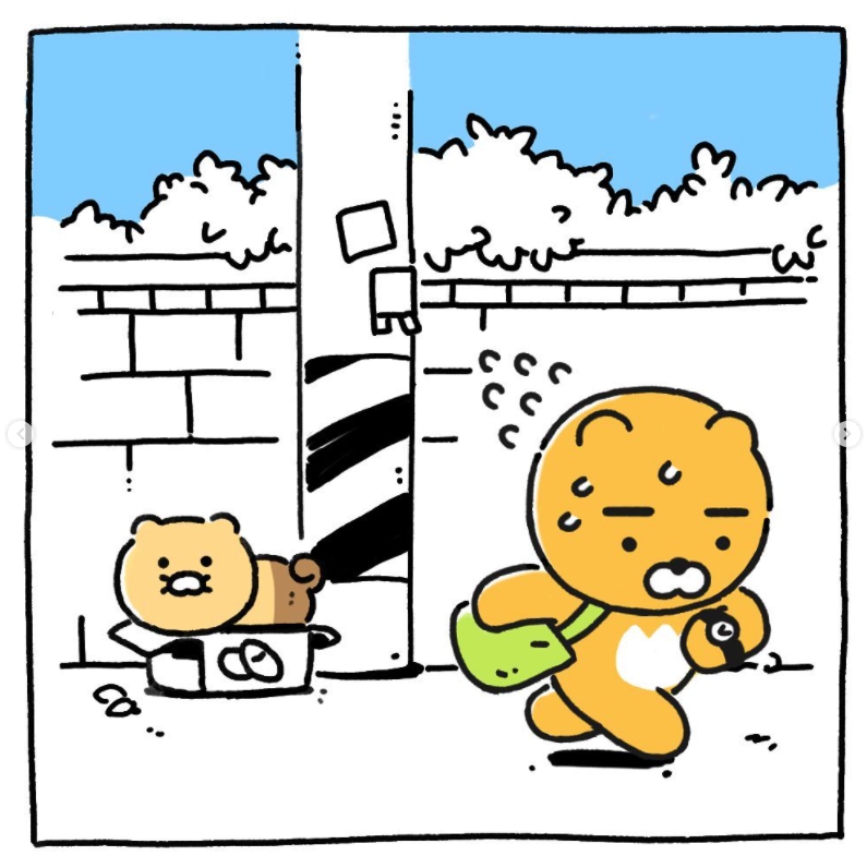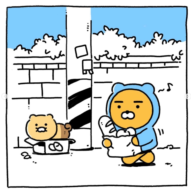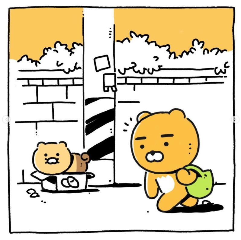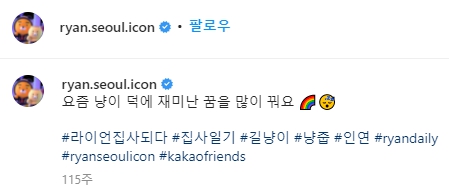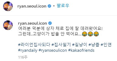 카카오프렌즈는 라이언의 인스타그램에 라이언이 길가다가 고양이를 줍는 글을 올립니다.