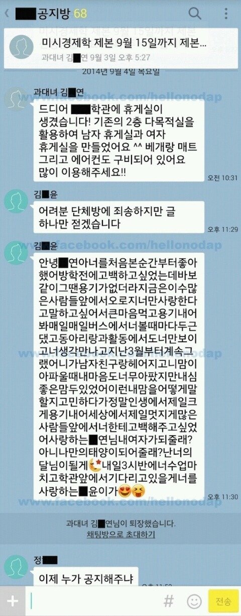 어느 대학교 경제학과 단톡방에서 과대로 활동중인 여성이 공지를 올리자, 어느 한 동기로 추정되는 남자가 단톡방에서 공개고백을 했으나 과대가 단톡방에서 나가버립니다. 이에 마지막에 다른 사람의 '이제 누가 공지해주냐'라는 말이 많은 사람들에게 큰 웃음을 주며 널리 퍼졌습니다. '이제 누가 공지해주냐'를 줄여 이누공으로 불립니다.