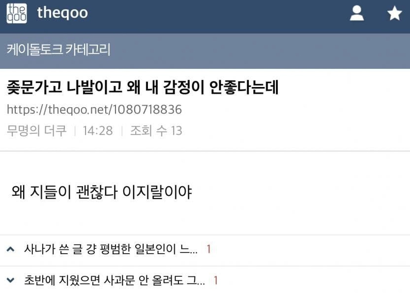2019년 트와이스 사나가 일본 연호를 사용한 것을 두고 여초 커뮤니티들에서 이에 대해 근거 없는 비난을 가했었습니다. 더쿠 역시 그런 커뮤니티 중 하나였고, 이후 역사학자들이 연호 사용은 일본의 군국주의와 관련이 없다고 설명을 해도 이를 무시하고 비난을 이어갔습니다. 그 중 대표적인 것이 위의 'ㅈ문가고 나발이고 왜 내 감정이 안좋다는데'라는 제목으로 '왜 지들이 괜찮다 이ㅈㄹ이야'라는 내용입니다. 이걸 가지고 다른 커뮤니티에서 '내기분상해죄'라며 조롱했고, 그게 현재까지 이어졌다고 할 수 있습니다.
