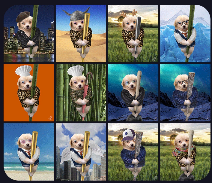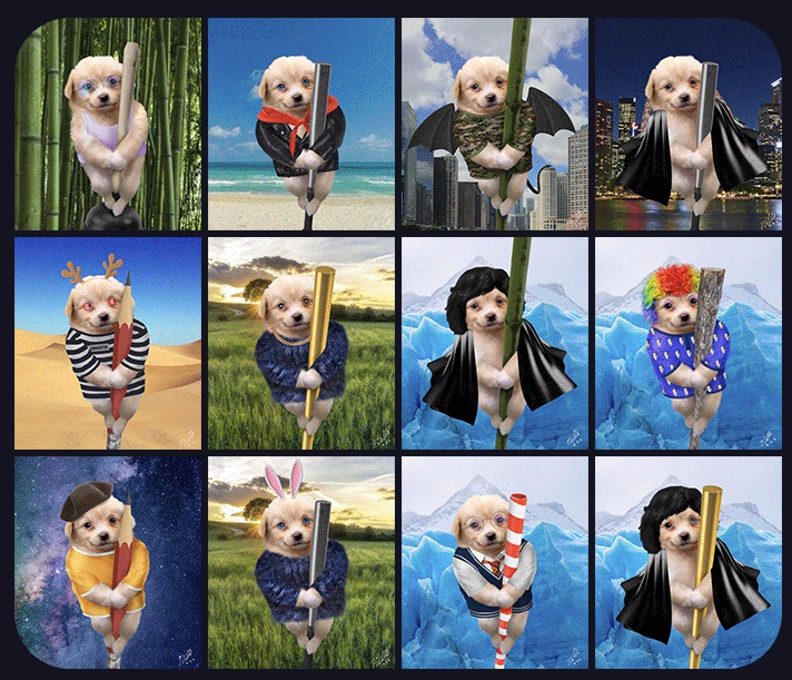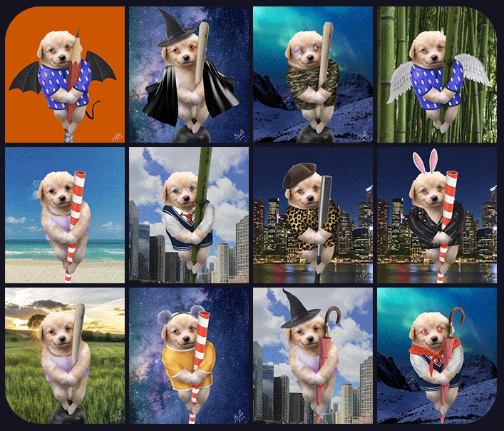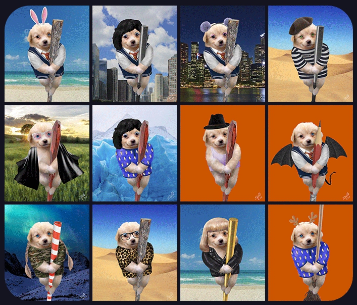 개죽이 NFT는 배경(10종), 옷(10종), 눈 색(10종), 봉(10종), 액세서리(25종)을 랜덤으로 장착한 25만개의 고유한 디자인으로 발행됩니다.