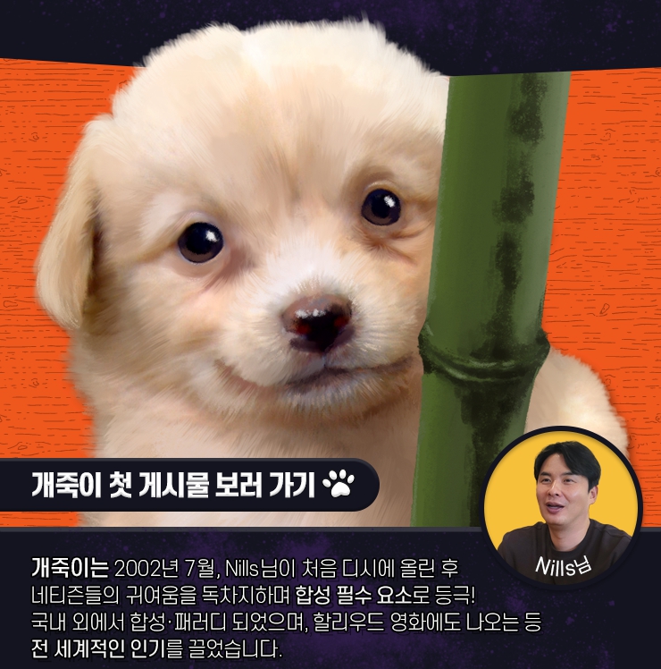 2002년, Nills라는 유저가 회사 앞마당에서 기르던 진돗개와 잡종견 사이에서 태어난 5마리 새끼 중 한 마리가 대나무에 매달려 있는 사진을 올립니다. 해당 사진은 디시인사이드를 비롯한 각지로 퍼져나가고, 네티즌들은 이 개를 보고 '개죽이'라는 이름을 지어주었습니다. 이후 개죽이는 오랫동안 디시인사이드의 마스코트 역할을 하게 되었고, 그게 현재까지 이어지고 있습니다.