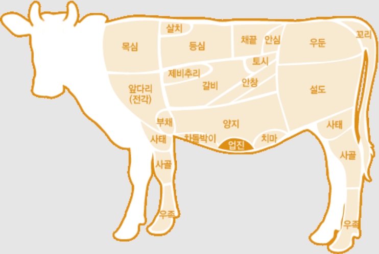 본래 업진살의 뜻은 소고기 부위 중 하나인 우삼겹을 뜻하는 말입니다. 우삼겹은 차돌박이와 양지 사이를 얇게 썰어낸 부위를 말하는데, 누군가가 삼겹살과 비슷하게 생겼다고 말한 데에서 우삼겹이라고 불리게 되었다는 설이 유력합니다. 또한 차돌박이와 비슷하나 조금 더 맛이 강한 편입니다.