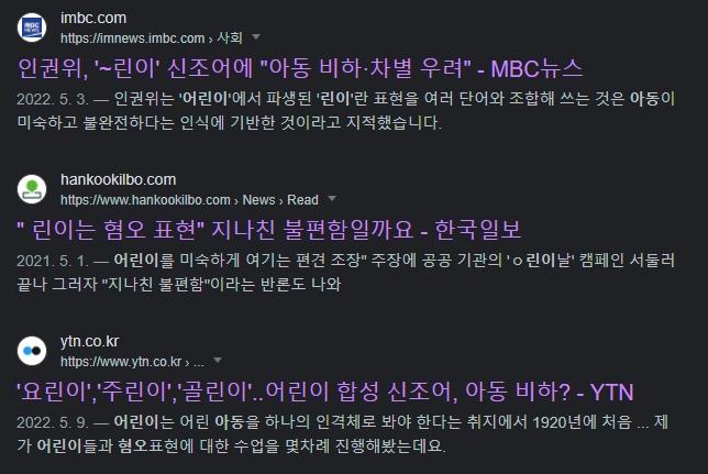 국가인권위원회는 2022년 어린이날을 이틀 앞 둔 5월 3일 각 분야의 초보자를 어린이에 빗댄 신조어가 아동을 비하하고 차별을 조장할 수 있다며 무분별하게 사용하지 말아야 한다고 밝혔습니다. 인권위는 “‘∼린이’ 표현은 아동이 권리의 주체이자 특별한 보호와 존중을 받아야 하는 독립적 인격체가 아니라 미숙하고 불완전한 존재라는 인식에 기반한 것”이라며 “아동에 대한 부정적인 고정관념을 조장할 수 있다”고 지적한 것이죠. 이어 “이런 표현이 무분별하게 확대·재생산되면서 아동에 대한 왜곡된 인식과 평가가 사회 저변에 뿌리내릴 수 있다”며 “이로 인해 아동이 자신을 무시하고 비하하는 유해한 환경에서 성장할 우려가 있다”고 우려하기도 했습니다.