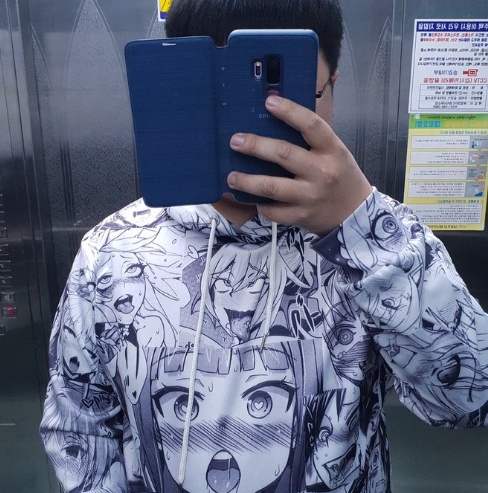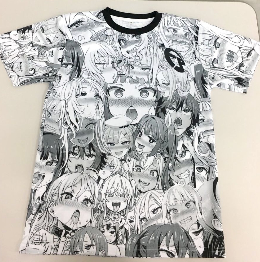 아헤가오 얼굴이 잔뜩 그려진 옷들도 나왔는데요, 이를 장난삼아 '아헤가옷'이라 하기도 합니다. 실제로 입고 다니는 사람들이 있어서 종종 남들이 찍어 SNS에서 화자가 되기도 합니다. 원래는 서양권에서 제일 먼저 발견되었으며, 현재는 우리나라에서도 저런 옷 사진이 올라오고 있습니다.