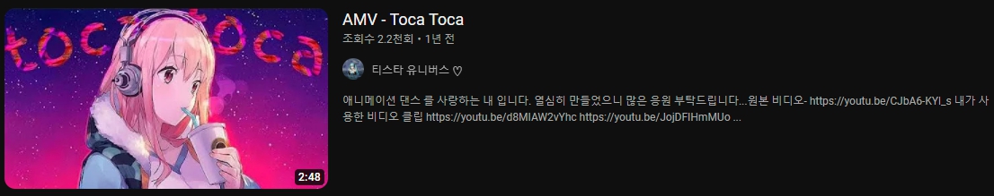 위의 영상과 함께 아래 내용들을 보면 2년 전 부터 노래 Toca Toca에 여러 애니메이션 캐릭터들이 춤을 추는 것을 편집한 영상은 많았습니다. 그러던 중 2021년 말에서 2022년 초 사이에 만들어진 짧은 토카토카 댄스 편집 영상이 틱톡을 시작으로 큰 인기를 끌게 되었고, 이게 Toca Toca 챌린지로 이어졌습니다. 이게 유튜브까지 파고들며 본격적으로 유행하게 되었습니다.