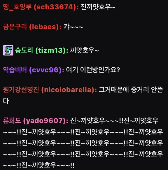이후 이 '중끼얏호우~'가 인터넷 방송 플랫폼 트위치로 옮겨가게 되었으며, '근하하하(중하하하)'와 같은 의미로 못 봐줄만한 혹은 갑뿐사 도네이션에 대해 채팅으로 '중끼얏호우~' 혹은 앞에 다른 말을 넣어 'X끼얏호우'를 사용하였습니다. 이게 점차 퍼지면서 현재는 '중'을 빼고 그냥 단순히 '끼얏호우'로 표현하며 자신이 신난다는 것을 표현하는데 사용하기도 합니다.