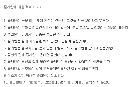 축구선수 즐라탄을 신격화하는 밈으로서, 말도 안되는 일들을 즐라탄은 해냈다는 식의 댓글입니다. 예를 들면 '벼는 익을수록 고개를 숙이는 것이 아닌, 그저 즐라탄에게 충섬심을 표하는 것이다'와 같은 내용들이 있습니다. 보통은 '즐라탄이 태어나자 의사가 울었다', '변호사는 즐라탄을 선임할 수 있다'와 같이 역할을 바꾸는 내용이 많습니다.