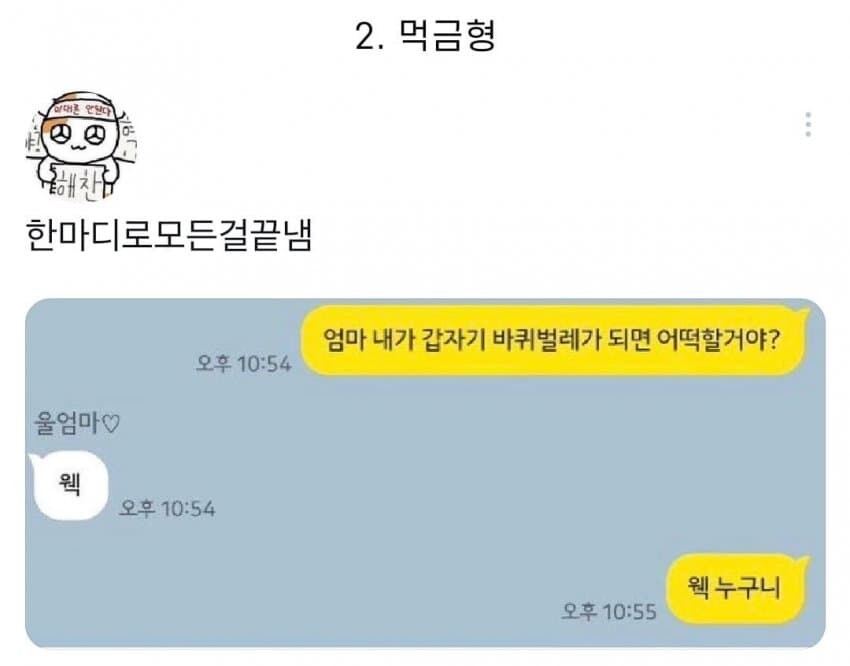 '엄마 내가 바퀴벌레가 되면 어떡할거야?'라는 다소 어이없을 수도 있는 질문에 재치있는 답변부터 현실적인 답변들까지, 부모 세대들의 다양한 유쾌한 답변들이 있네요. :)