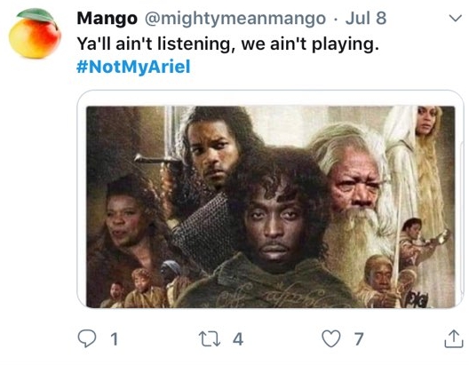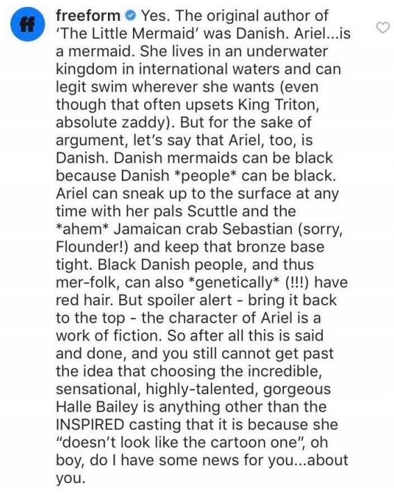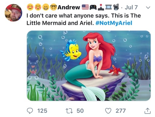 한편 디즈니의 흑어공주 캐스팅이 미스캐스팅이라고 생각하는 많은 전세계 사람들이 인스타그램이나 유튜브 등 SNS에서 #NotMyAriel(내 아리엘이 아니다) 해시태그를 다는 항의들이 올라오기도 했습니다. 이에 대해 디즈니 산하 채널인 Freeform은 이를 비판하는 사람들을 '불쌍한 영혼'이라 칭하는 내용을 인스타그램에 게시하여 작품을 비판하는 사람들을 대놓고 비하하는 반응을 보였습니다.