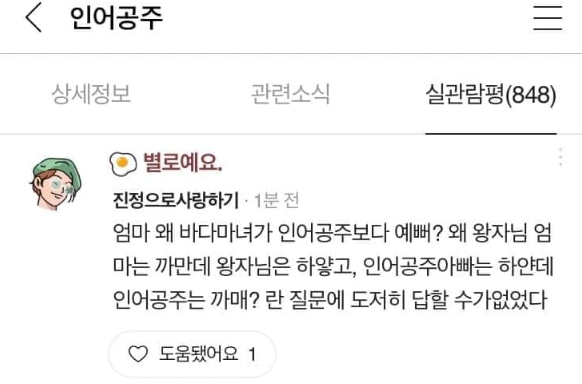 실제로 아이를 데리고 인어공주를 함께 본 엄마들의 말에 의하면 아이가 겁을 먹고 울음을 터뜨렸다는 관람평이 간혹 보입니다.