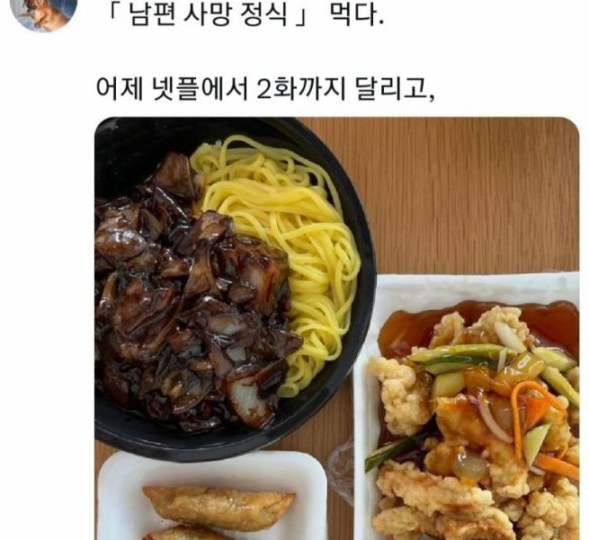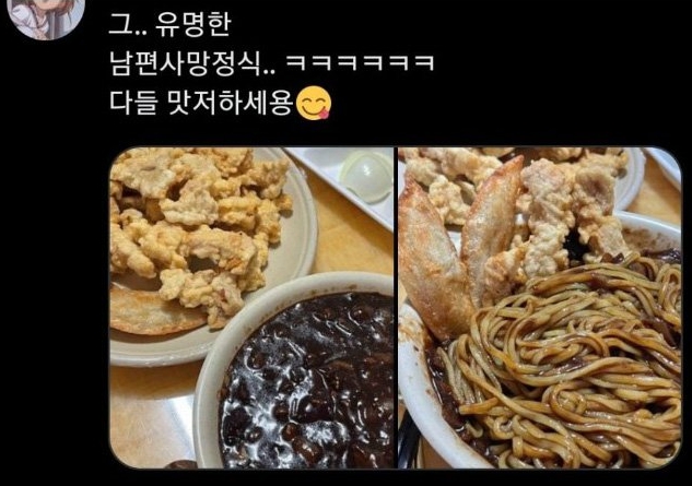 ENA 드라마 마당이 있는 집에서 작품 내 가정 폭력을 당하던 주인공 추상은(임지연)이 남편인 김윤범(최재림)이 사망했다는 소식을 듣고 참고인으로 조사를 받은 후 중국집에서 식사하는 장면이 있었습니다. 추상은은 폭력적인 남편에게서 해방된 감정을 혼자 짜장면, 탕수육, 군만두, 콜라 한 캔을 먹는 모습으로 해방시켰습니다. 해당 음식 구성을 그대로 '남편 사망 정식' 또는 '남편 사망 정식 세트'라 칭하며 인증하는 것이 트위터에서 유행이 되었습니다.