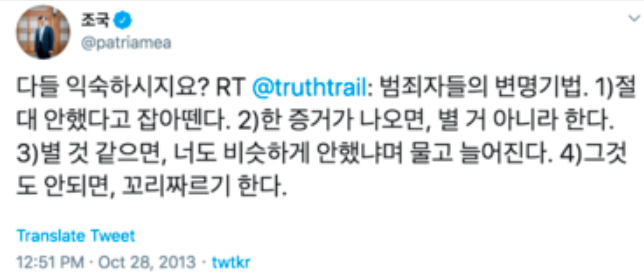 조국은 사모펀드, 웅동학원의 수상한 소송도 부인과 함께 그저 "모른다", "아니다"라고 일관했었는데 2013년 트위터에 그가 올렸던 글을 보면 지금의 조국의 대처에 대해 지적하는 트위터라 해도 별 이상이 없는듯한 내용입니다.