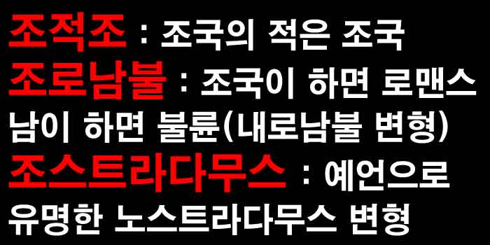 제목을 보면 알 수 있듯이 오늘 알아볼 말은 조적조, 조로남불, 조스트라다무스라는 말들을 알아볼텐데요, 미리 말씀드려보자면 해당 글은 어디까지나 단어의 뜻이나 유래를 모르는 사람들에게 어떤 말인지 알려주려는 포스팅이지, 결코 정치적으로 비난하려는 의도가 없음을 알려드립니다.