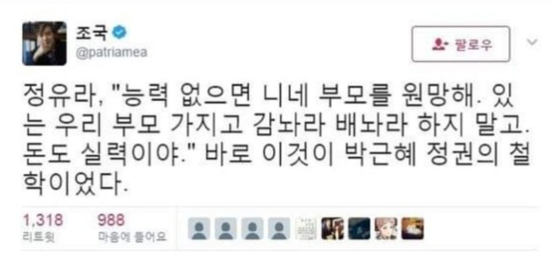 당시 정유라가 특혜를 받아 대학교에 진학한 내용을 비꼬는 내용의 트위터인데요, 현재는 조국의 딸 조민이 부정입학을 했다는 의혹이 발견되었고, 조국의 아내이자 동양대학교 교양학부 교수인 정경심은 딸 조민의 부정입학을 도왔는데요, 문서를 위조하는 등의 혐의로 수감까지 되었었습니다.