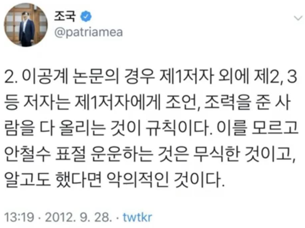 이른바 조국 사태가 커지면서 조국의 딸의 고등학생 시절 의학논문의 제 1저자에 등재된 것과 관련해서 "지금 시점에서 보면 고등학생 딸이 논문의 제 1저자로 되어 있는게 의아하다고 생각된다"라고 주장을 했는데, 위의 트위터에 쓴 글을 보면 논문에 대해서 어느정도 알고 있는 사람이란 사실을 알 수 있습니다.